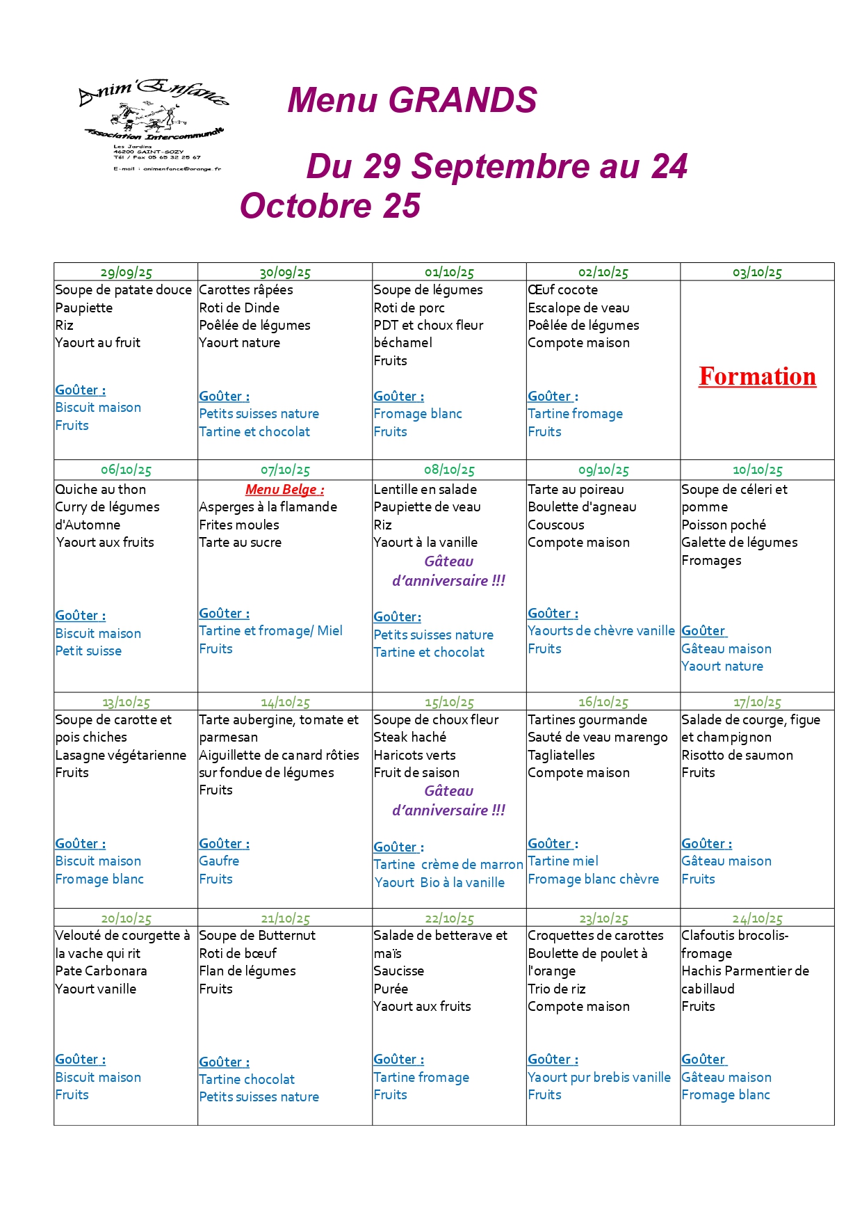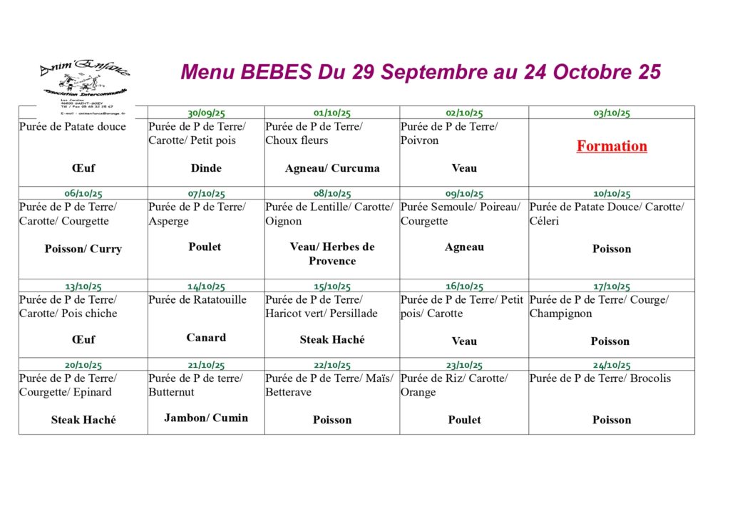 MENUS DES BEBES ET DES GRANDS DU 29/O9 AU 24/10/2025